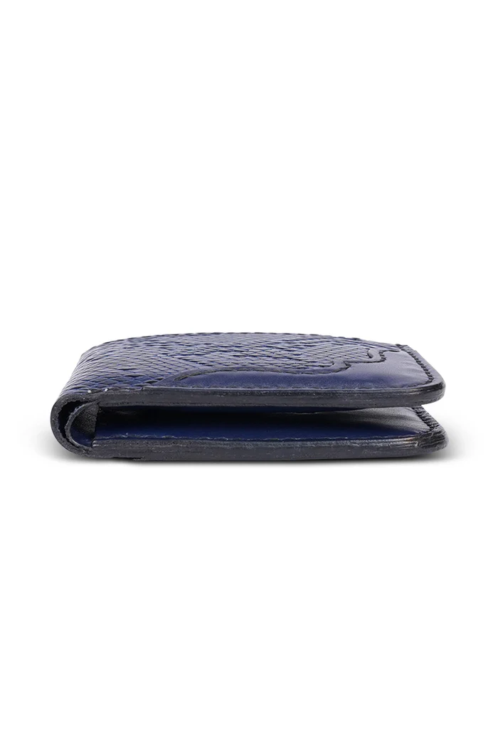 Matte Saffiano leather bifold wallet, Bifold design, KORDOVAN embossed, Interior large bill slot + security slots, Transparent id window, Interior card slots, Topstitching + seaming details